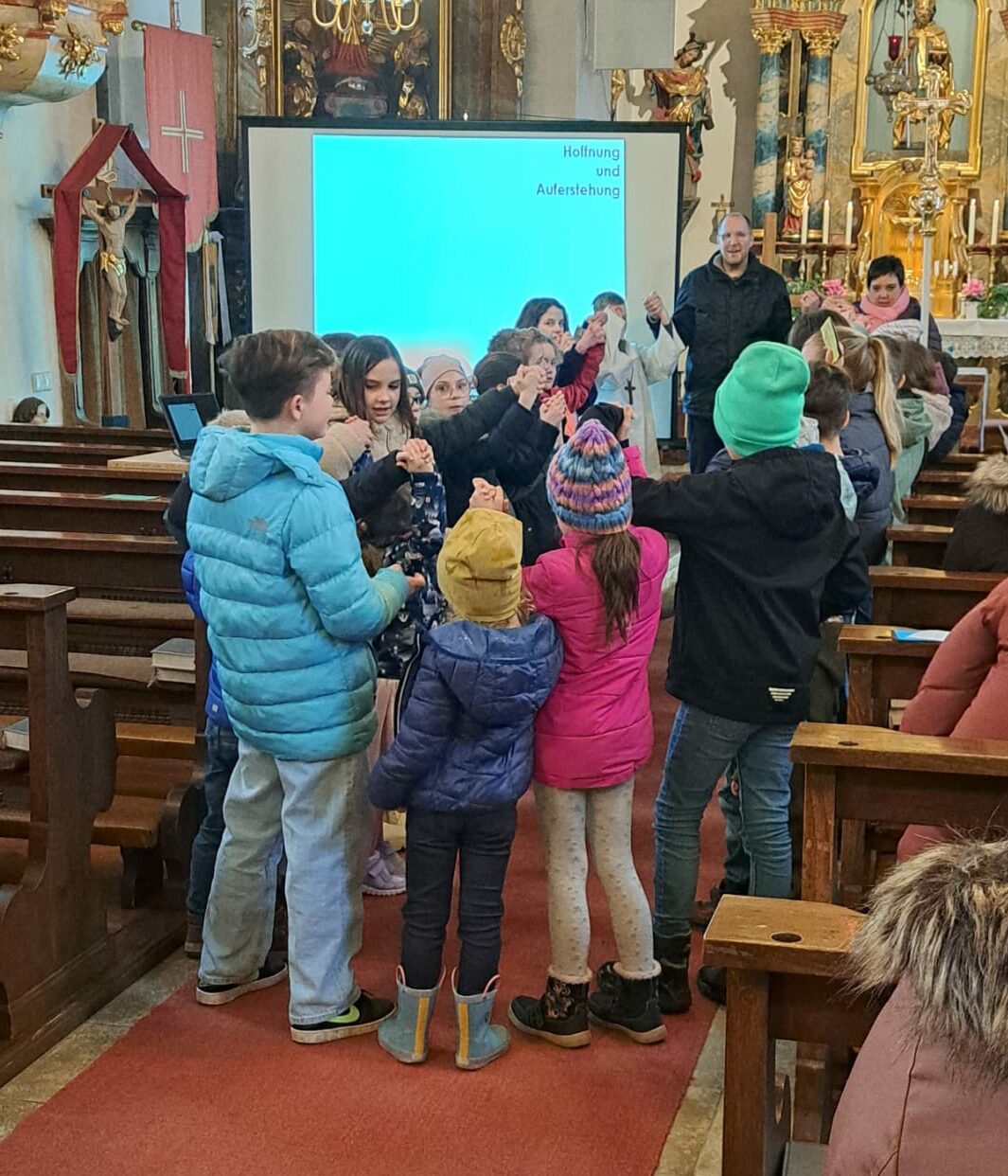 Zu Beginn erhielten die Kinder farbige Karten, die sie durch den gesamten Kreuzweg begleiteten. Über den Beamer konnten sie die Stationen des Leidenswegs Jesu Schritt für Schritt verfolgen. Jede Station wurde mit einer Farbe verbunden: Rot für Schmerz und Blut, Grün für Hilfe und Hoffnung, Blau für Tränen, Schwarz für den Tod und Weiß für die Auferstehung. So wurde der Weg Jesu für die Kinder sichtbar und erfahrbar – sie konnten die Gefühle, die Jesus durchlebt hat, nachvollziehen und gleichzeitig eigene Erlebnisse einbringen.