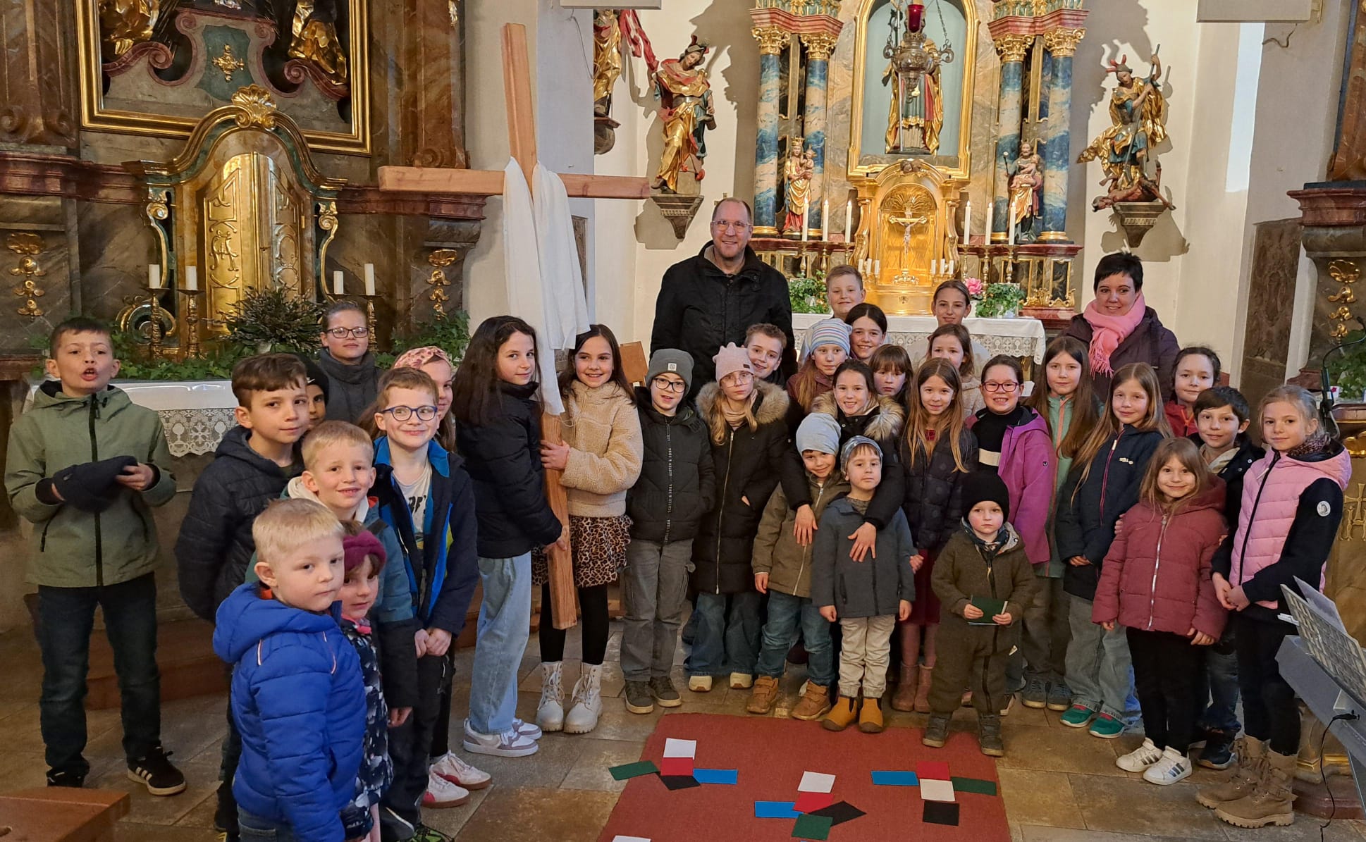 Ein besonders bewegender Moment war das gemeinsame Vaterunser: Die Kinder stellten sich im Mittelgang zu einem großen Kreis auf, hielten inne und beteten zusammen. Danach legten sie aus ihren farbigen Karten kleine Kreuze auf den Boden – ein leuchtendes, greifbares Zeichen für Glaube und Hoffnung.