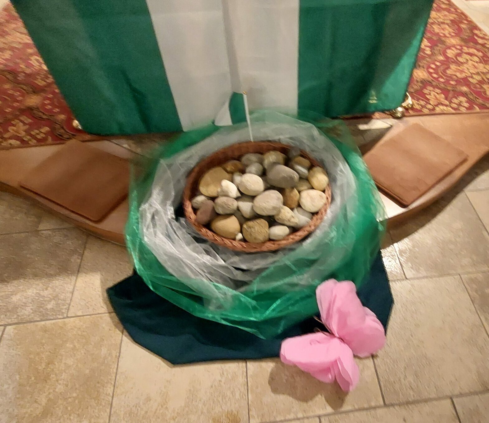 Im Mittelpunkt des Abends stand die Einladung Jesu aus dem Matthäusevangelium: „Kommt alle zu mir, die ihr mühselig und beladen seid.“ Als sichtbares Zeichen erhielten alle Besucherinnen zu Beginn einen Stein. Er stand für die Sorgen und Lasten, die jede im Alltag mit sich trägt. In einer stillen Besinnung konnten die Frauen darüber nachdenken, was ihnen gerade schwer auf dem Herzen liegt. Anschließend waren alle eingeladen, ihren Stein vor dem Altar abzulegen – ein bewegender Moment, in dem viele ihre Last symbolisch in Gottes Hände legten.